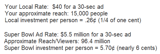 2) Your local ads are far less expensive per-person than Super Bowl ads. Do the math. For example: